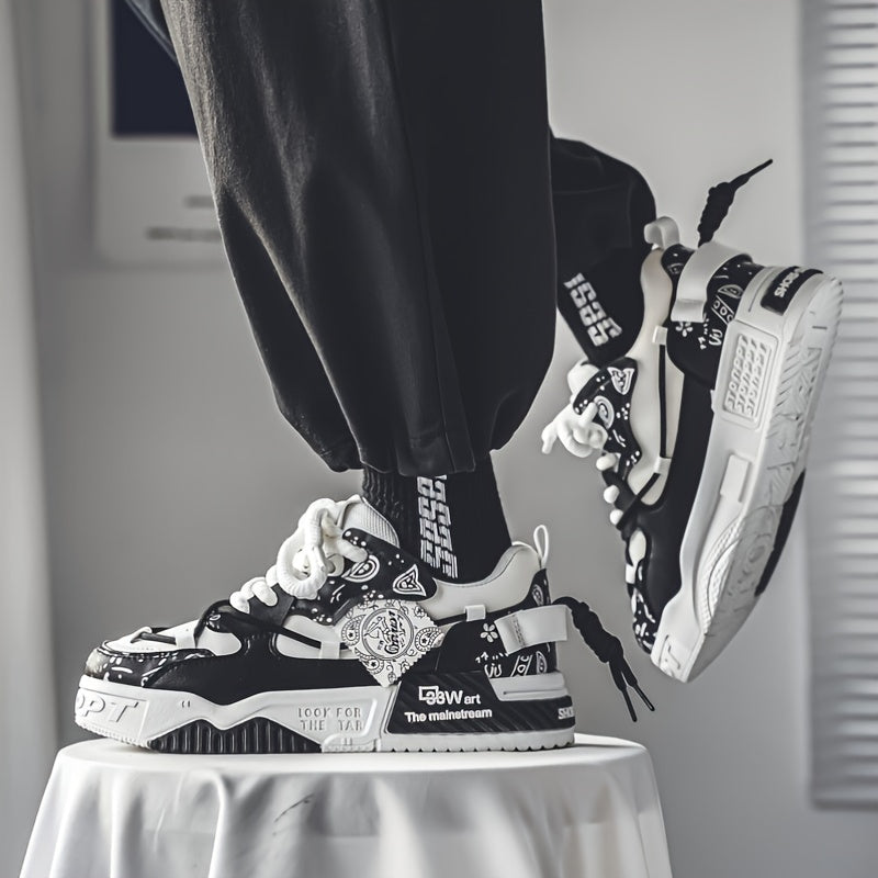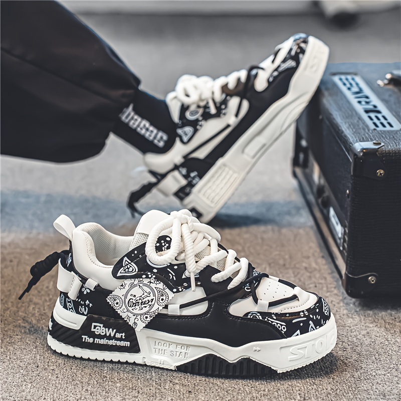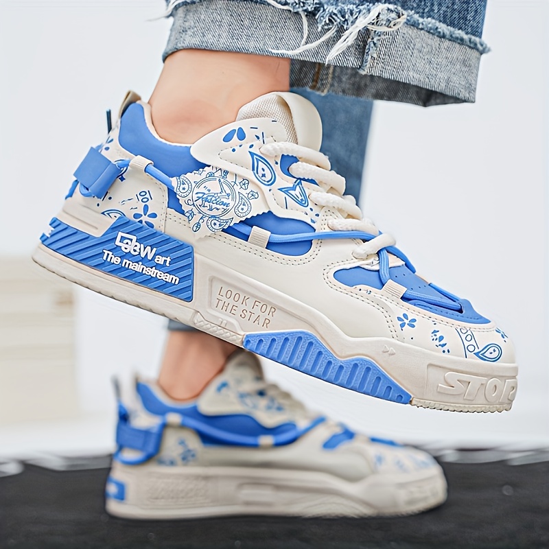 1 Pair Men's & Unisex Low-Top Skate Sneakers - Soft-Soled, Graffiti Camo & Letter Print (TPF/ST) Logo - PU Upper & Cushioned Tread - All-Season Casual Shoes for Skateboarding, College, Commuting - Black/Blue/Green
