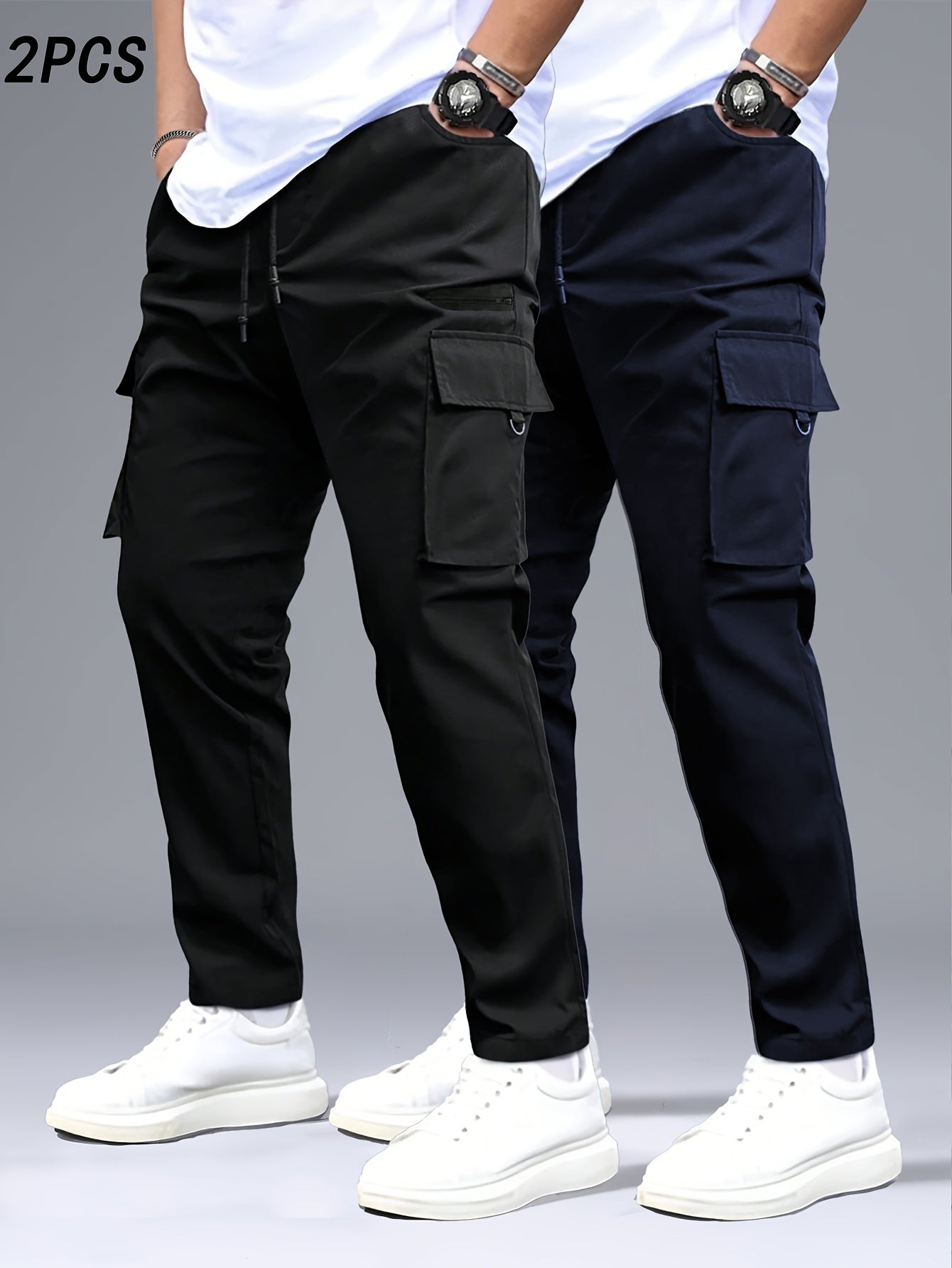 2pcs Men's Heavy-Duty Pants with Multi- Cargo Pants - Solid Color - Outdoor Pants, Belt Loops & Drawstring Waist, Machine Washable for,, Casual Wear (Regular Fit)