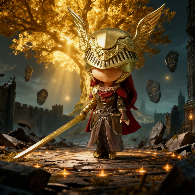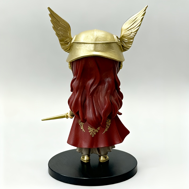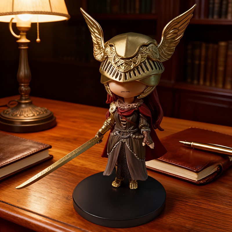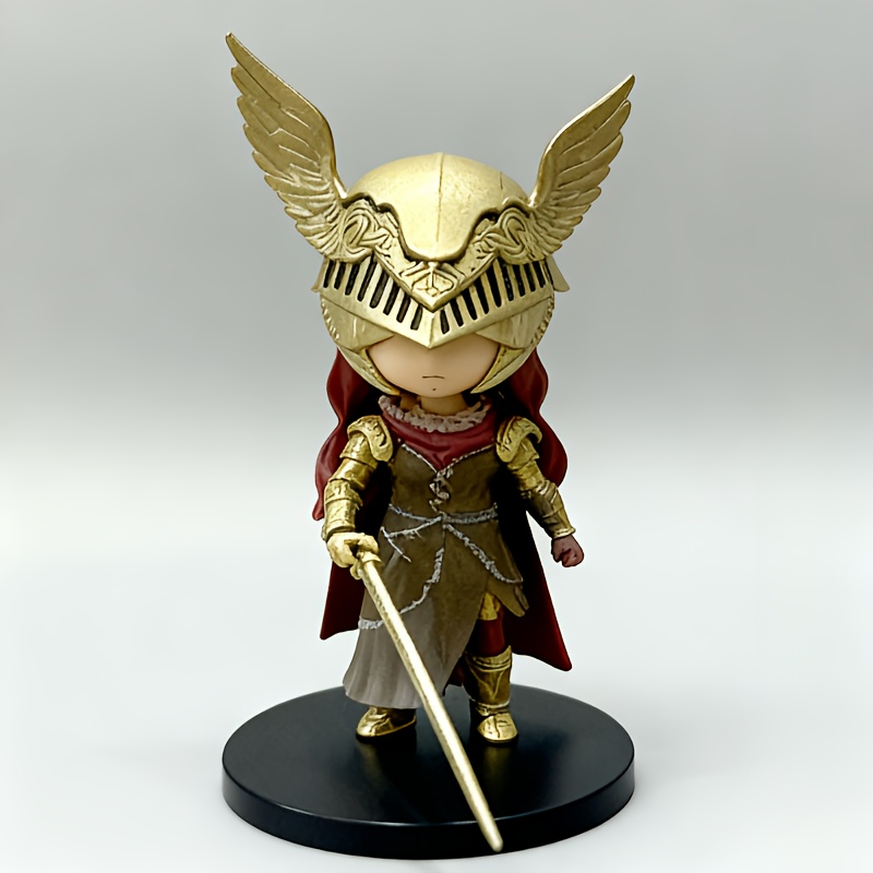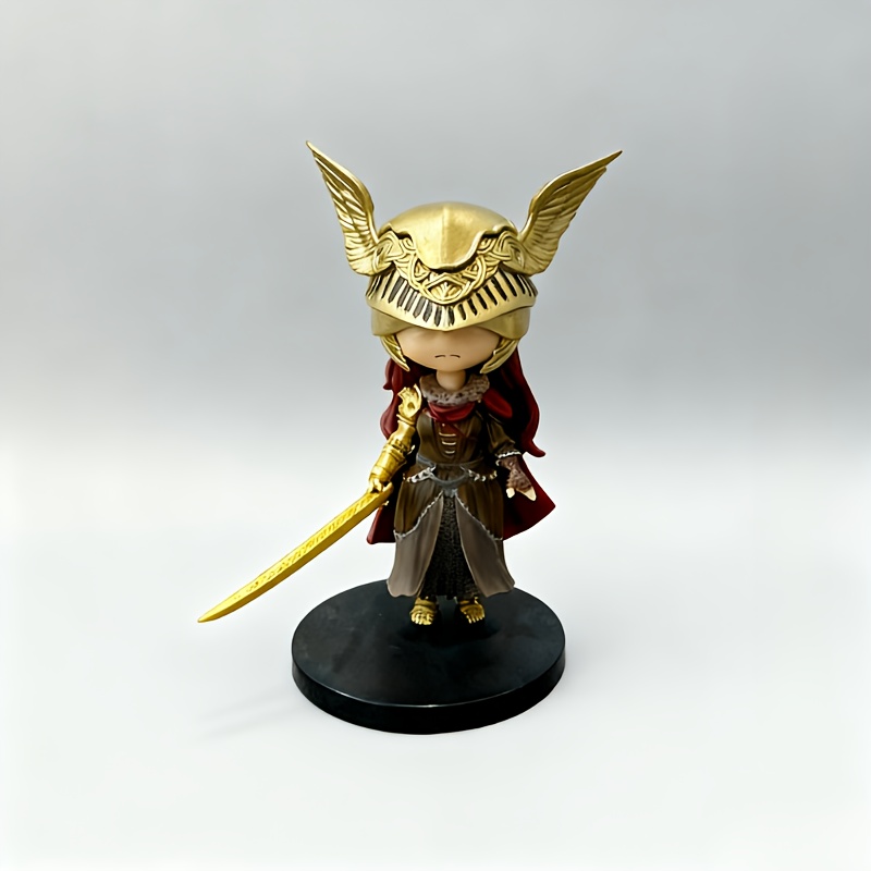 Collectible Figure of a Chibi Character in Anime Style, Featuring Golden Helmet Armor And Red Hair, Designed with a Sword And Intricate Details